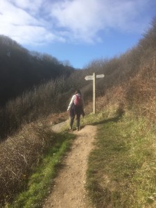 On reaching a high point at Petard Point we did find a nice comfortable, windless sun trap and we sat for a while. I saw two other people ahead of us walking along the same path. I knew from my planning that there’s a hotel approximately 1/2 hour away and I mentioned this to Gemma. The ‘Hayburn Wyke Inn’ is located only a few hundred metres off the coastal path and was seemed well worth the short diversion. There were lots of tracks running through the woods at Hayburn Wyke and it needed some careful navigation to get through the trees. On reaching the Inn we met several other walkers, including the couple I had seen in the distance earlier near Petard Point. It was nice to sit and have another hot drink, the sun was now shining and the wind had finally died down.