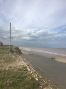 I was begrudgingly directed to the road and this resulted in me walking around the danger area of Cowden Sands. After an hour of walking along the road I reached Aldbrough and popped into a small shop for a can of fizzy pop and a chocolate bar. There was a seat a little further along the street which I decided to make use of. I rejoined the coast near Grimston and the next few miles were nice walking along the now higher cliffs . There were 2-3 occasions when the path/minor road disappeared over the cliffs and I was forced to go inland slightly. I really wanted to go onto the beach but wasn’t sure I’d be able to get back onto the cliffs if the tide came in. I continued along the edge of the cliffs until just before Withernsea where I was finally able to take to the beach.