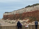 I stood around near the foot of the famous Hunstanton cliffs for a few minutes admiring the contrast between the vivid red sandstone and the white chalky layers. I saw the first national trails acorn logo, this confirmed we were, as expected now walking along the Norfolk Coastral Path. We spent the next few miles walking along the cliff edge then a little later through a soft red sandstone path. Various coloured beach huts lined up neatly on our left.
