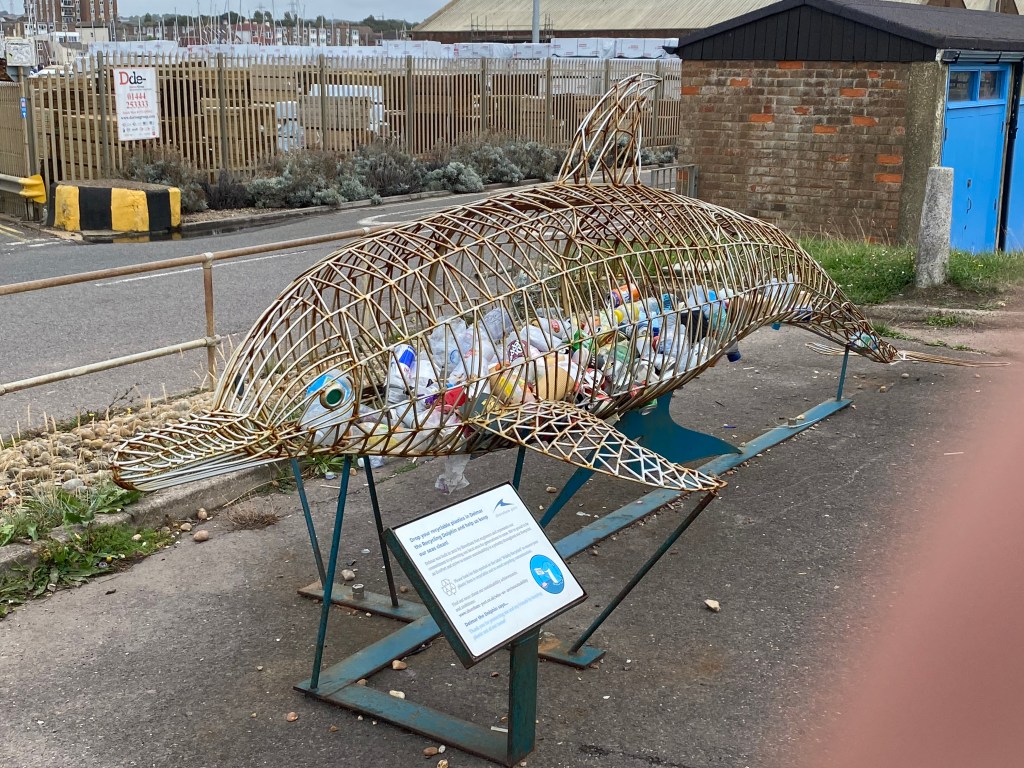 I continued through Brighton and then Hove until reaching the more industrialised area at Portslade-by-Sea. I chatted briefly with a cyclist who confirmed that the locks at Shoreham Harbour were open to pedestrians. I really didn’t fancy a wasted three miles if the locks were fenced off for any reason. I stopped and sat for a while to watch a dozen or so surfers in the waters near Southwick. There was a small cafe a little further down the road where I bought myself a fizzy drink. I also noticed that they had a novel plastic waste bin in the shape of a dolphin. The locks at the Marina were easily crossed. For the first time today it began to rain, though not enough to require any waterproofs. I dropped into McDonalds on the A259 at Kingston-by-Sea and by the time I left an hour later the rain had completely stopped. The big decision now was which train station to use for the return to Brighton. There’s three options over the next four miles. I crossed the River Adur via Norfolk Bridge and just kept going. The path by the edge of the Widewater Lagoon nature reserve and onwards towards Worthing was easy going and I enjoyed the walking, especially as the sun had now made an unexpected appearance.