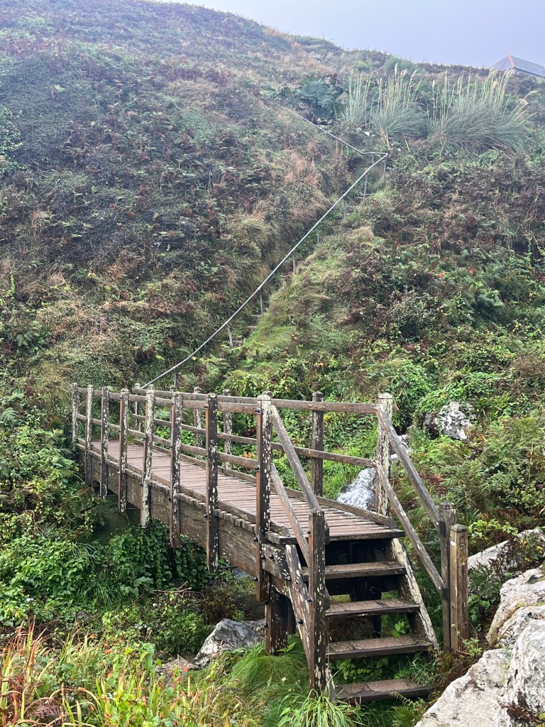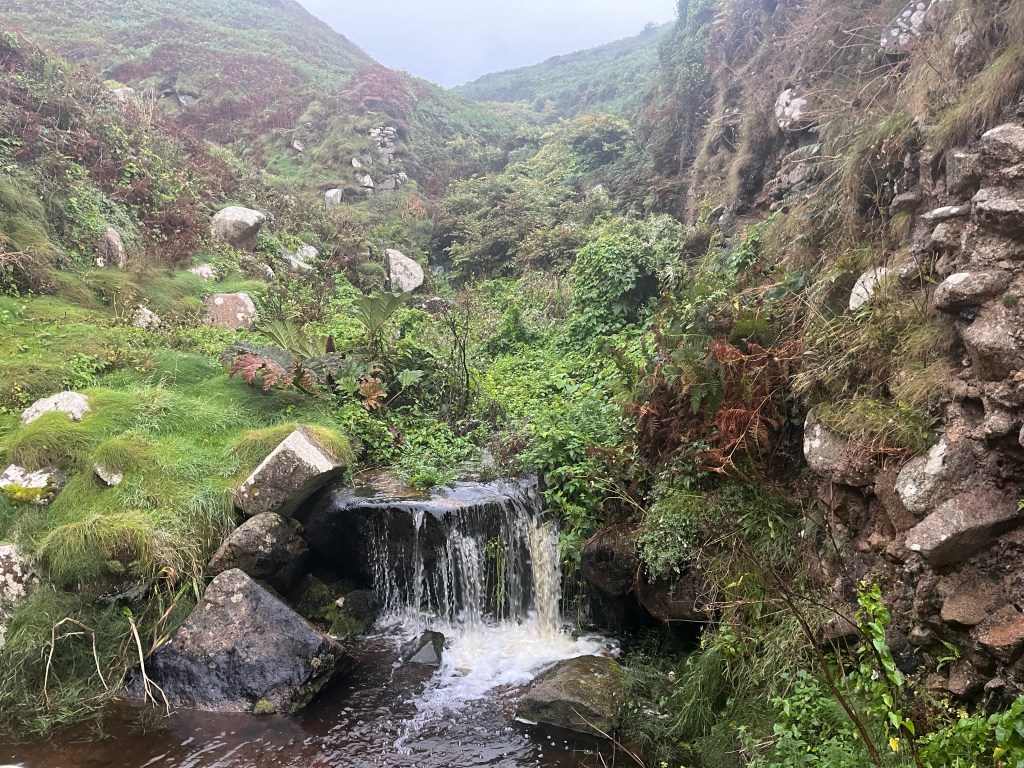 On sticking my head out of the tent this morning I immediately spotted the hazy red sky shimmering behind and above the lighthouse. I quickly ran through the ‘Shepherds delight/warning’ verse in my head trying to work out whether it was going to be a wet day or a dry day. I was feeling hungry, so I quickly made myself some breakfast before leaving camp and strolling off back towards the SWCP. The path turns right just before reaching the lighthouse and then climbed up onto Pendeen Cliffs. I put on a pair of waterproof trousers over my shorts as the path was narrow and the wet vegetation was soaking my legs. There’s lots more old derelict mine workings and signs warning of dangerous mine shafts along the path.