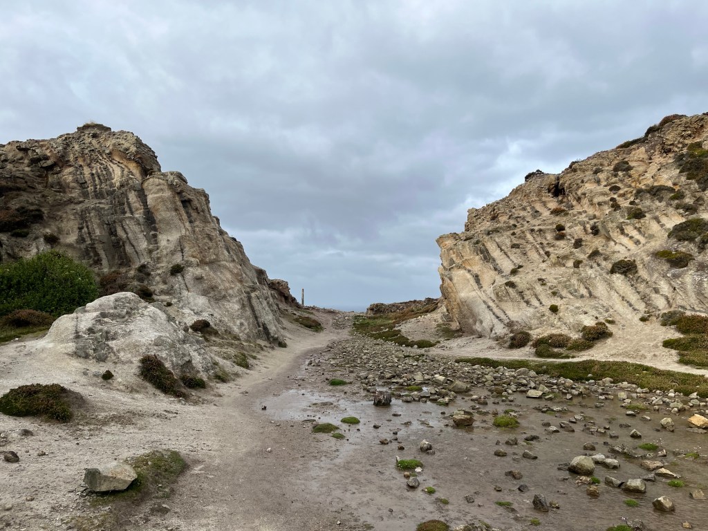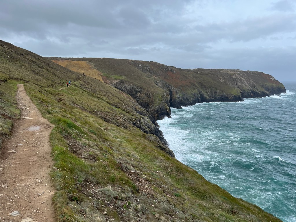 For the first time in three days I’m starting the day with dry socks and shoes. Thank you to Trevallas Manor Farm campsite for being fantastic hosts. The first few miles were visually interesting as I walked through the old mines and quarries near Hanover Cove. Walking through the boulder laden quarry felt a little eerie, particularly in the early morning mist. There’s also a sharp breeze blowing and it’s hitting me straight in the face as I turn past Cligga Head. I really enjoyed the next mile into Perranporth, a steady twenty minutes along the side of the sweeping cliffs. I could have stopped for a break in Perranporth however I’d only been going for an hour so just carried on walking.