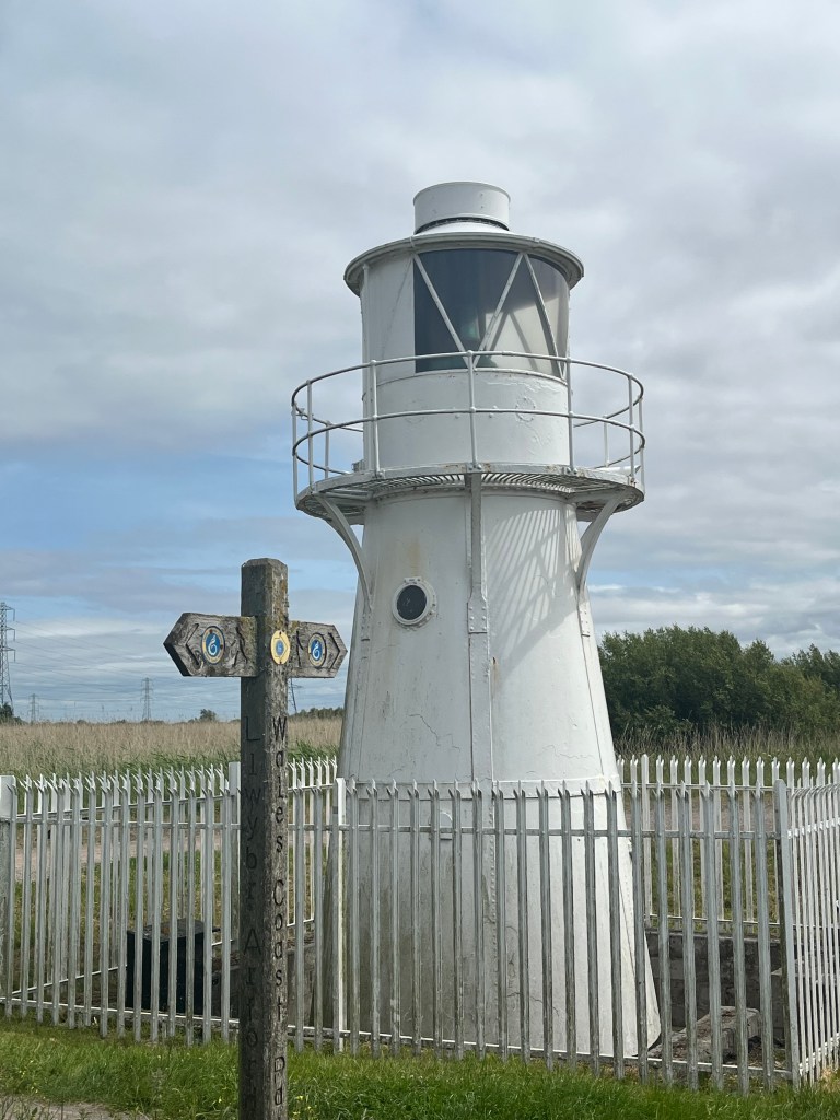 For the first week of this trip I’ve got my better half Gemma, my daughter Ruth and dog Alfie for company. I don’t think they’ll be doing very much walking, but it’ll just be nice to have a bit of company each night, for a few days at least. Early on Saturday morning I caught the train back to the Severn Tunnel Junction and immediately set off back towards the coast. The route for the first two miles is along another flat sea defence wall. It was interesting to once again note the different attitude and care given to the path by the various landowners. I could walk across a nice manicured flat path for ten minutes but then pass through a gate and then have to struggle through knee high vegetation. There’s several sluices and water features to cross and thankfully each one in turn was easily accessible. I was disappointed to see that there’s two pubs noted on my map which are now permanently closed down and boarded up, fortunately I’m not desperate for any food or drinks. Near Goldcliff I entered the Newport Wetlands nature reserve where I encountered the usual mix of bird watchers and dog walkers. I spoke to a builder carrying out repairs on a bungalow and he was decent enough to fill up my water bottle. A few minutes later I stopped for an extended break close to the small lighthouse at Goldcliff.