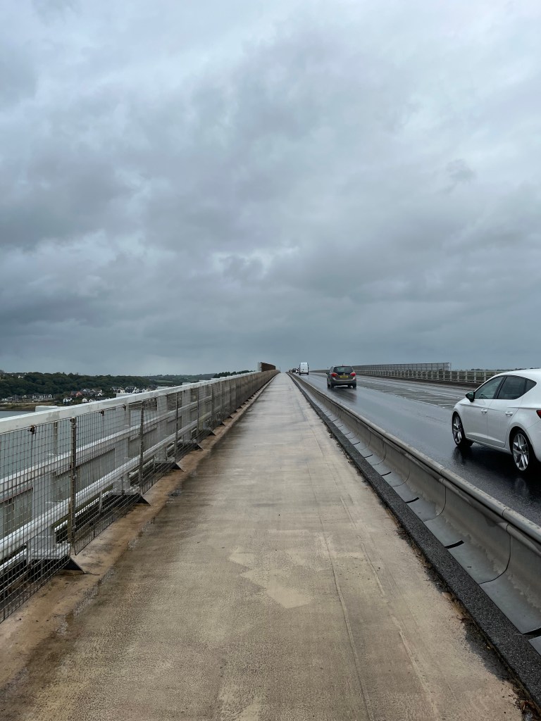 I arrived in Pembroke Dock around 9am after a non stop seven hour drive from Northumberland. I’ve pre paid a month in advance to park in the Pembroke Dock Tesco car park. After finding a parking space I grabbed my backpack and locked up the car hoping that it’s still going to be there and undamaged in twenty six days time. It’s raining as expected and I was wearing my waterproof jacket and over-trousers as I set off walking. Minutes after leaving Pembroke Dock I was crossing over the Cleddau bridge over Milford Haven estuary. The coastal path then skirted adjacent to the main road around the Northern side of the estuary until I arrived at Neyland. The route then passes through a narrow and short copse of trees. I’m happy that the trees are dense enough to give me some temporary relief from the persistent rain. There’s a short climb before the route skirts past a heavy industrial area and oil refinery for around two miles. There’s more thick wooded areas planted along the route so the industrial factories and other huge buildings couldn’t spoil my view and my walking experience. I entered Milford Haven via Black Bridge and headed towards the Marina. The rain had increased and low cloud had now covered the area ruining any further views. I chanced upon a McDonald’s restaurant close to the Marina and decided it was the perfect place to get out of the rain. I entered the restaurant, ordered a hot drink and found a dry place to sit.