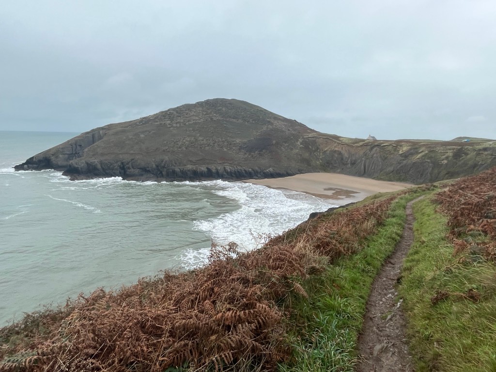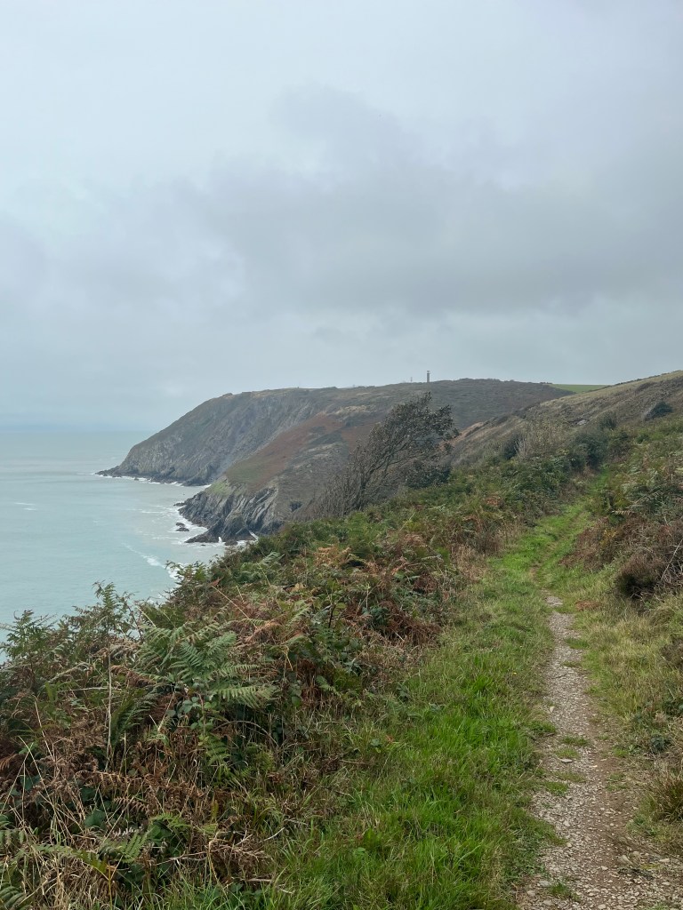 I noticed that there’s a nice, reasonably flat and straight path across the farm fields for the next mile or two, however that isn’t the official coastal path. The proper coastal path is far more complicated, meandering up and down and around each individual small bay. An hour later I was skirting around Ferwig Beach and got a pleasant surprise when I chanced across an open cafe. It was actually a small stone building with a coffee machine, a selection of chocolate bars and some seating. I chatted with the young lady working in the cafe for several minutes and watched a single surfer in the water. I took a wrong turn soon after leaving Ferwig Bay but got back on track after only a few minutes. I wasn’t sure where I’d be stopping tonight and despite considerable research I couldn’t locate any campsites close enough to the path. There’s a relatively small Ministry of Defence range on the Western edge of Aberporth which I wasn’t able to access and had to divert inland for a half mile. As I walked through Parcllyn a suburb of Aberporth I got chatting to a man, named Gary who was busily washing his car. As a result of our conversation Gary kindly telephoned a friend of his who owned a small local campsite. I was able to speak to the friend and arranged somewhere to sleep. The campsite had already closed for the season but the owner confirmed that it was okay to use the site which was located on the side of a hill just beyond Tresaith.