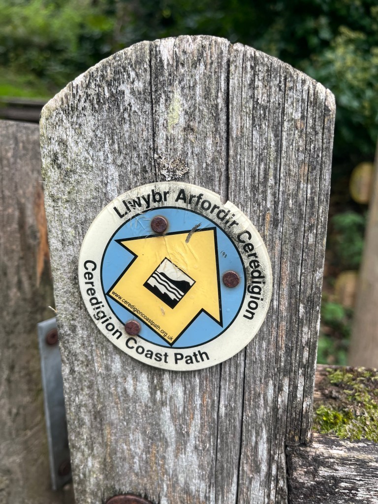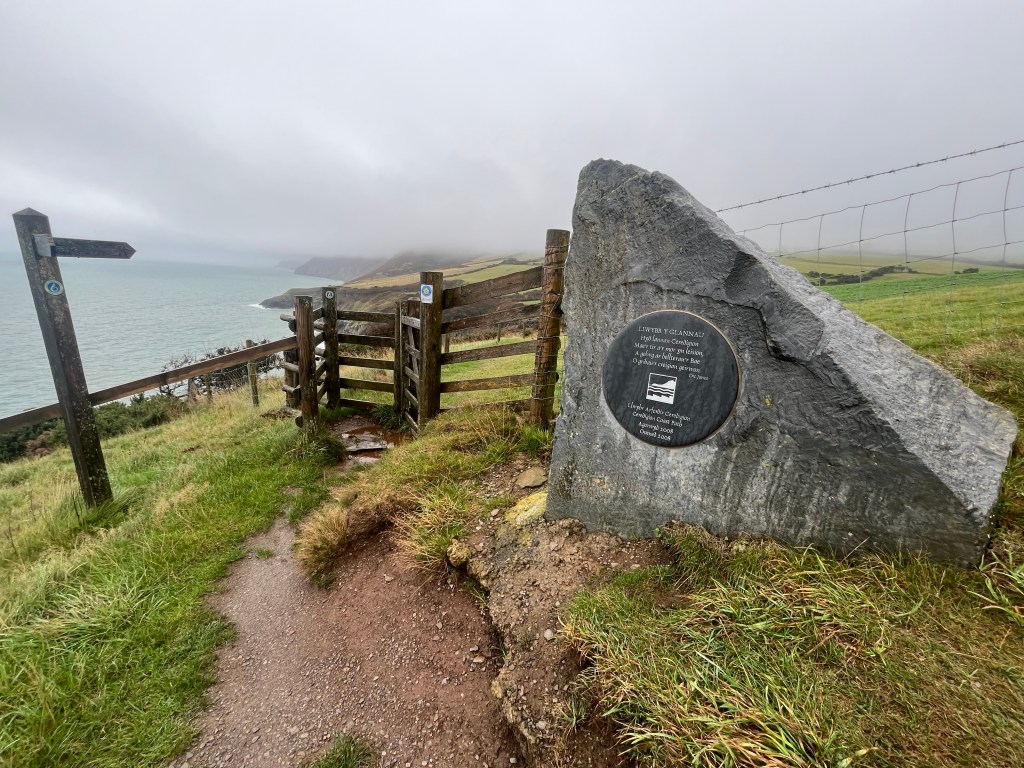 The fear of heavy rain during the night was misplaced. There were several light showers but nothing which caused any concerns for the ground or my tent. Once again I had set off today not knowing exactly where I would be sleeping tonight. I knew the weather would eventually turn miserable and wasn’t looking forward to trying to pitch my tent in heavy rain and 60mph+ winds. This would turn out to be one of the most difficult days that I’ve ever experienced during thousands of miles of walking over the last thirty years. When I packed up this morning around 7am it was overcast but dry that would change after about twenty minutes of walking. It began to rain and it didn’t stop for the rest of the entire day. It’s actually a nice walk across the first few hills with good views and solid paths. By the time I had arrived in Penbryn I was already desperately looking for somewhere to shelter. The villages public toilets were locked and it was far too early for the cafe to be open. I ended up ducking into an old stone lime kiln situated close to the beach for a few minutes before continuing. The next section of route was easy to follow despite the low cloud and there were lots of Ceredigion coast path signs to help with navigation.