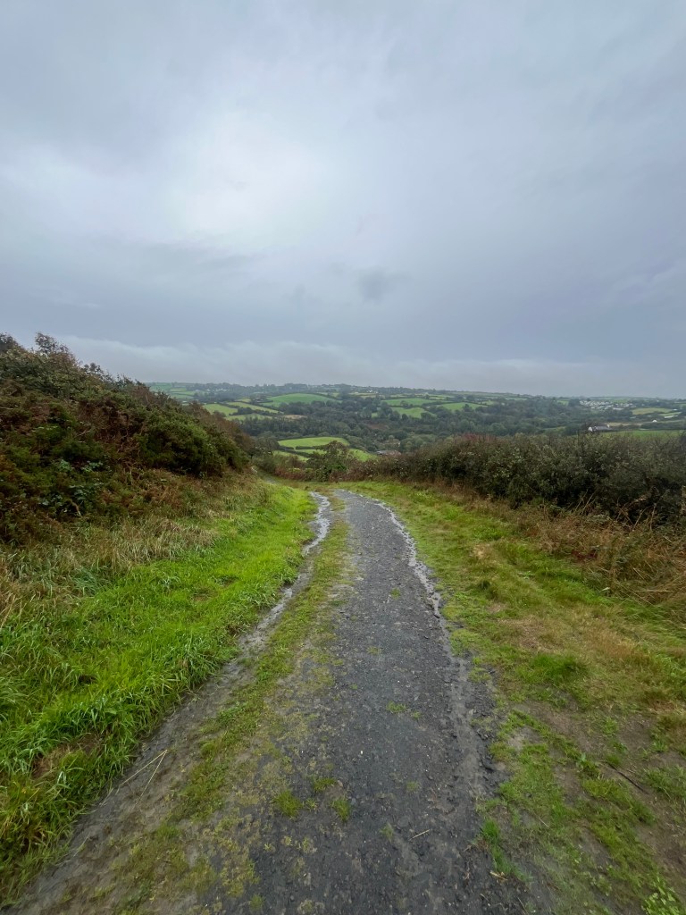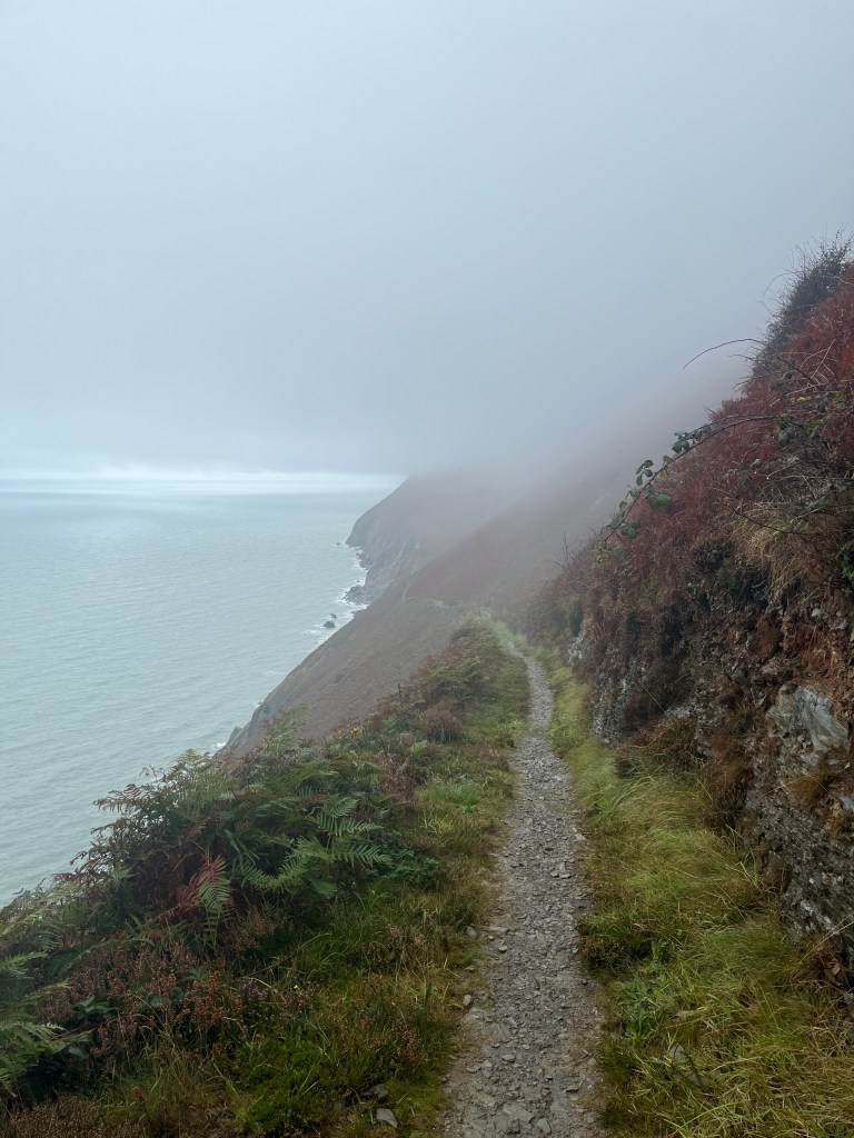 There’s a good stone path out of Penbryn which continued through the fields and across the hills until I reached the cliffs above Llangrannog. The hill top is guarded by a statue of St Crannog, a 6th century Welsh Abbot confessor who was born in Ceredigion and established a church nearby. Llangrannog is a reasonably sized town with a good selection of places to eat. I grabbed a coffee and a cheese/ham filled croissant from a cafe and tried to dry myself out. The rain had intensified a little and the next section of route zigzagged to over 100mts above sea level. There’s a great but narrow path across the side of the cliffs for the next two miles. I wished the weather had been better as there was potential for some great views. The next village on route was the unpronounceable Cwmtydu. There was no reason to linger so I just walked straight through and didn’t stop.